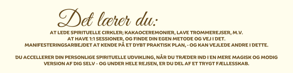 Du kan deltage for din egen personlige udviklings skyld, fordi du ønsker et liv der føles mere rigtigt, et liv med mere flowfølelse og kontakt til “det større” – eller fordi du gerne vil ud og skabe dit eget job, med spirituel rådgivning i 1:1 sessioner eller som spaceholder ved cirkler og ceremonier.