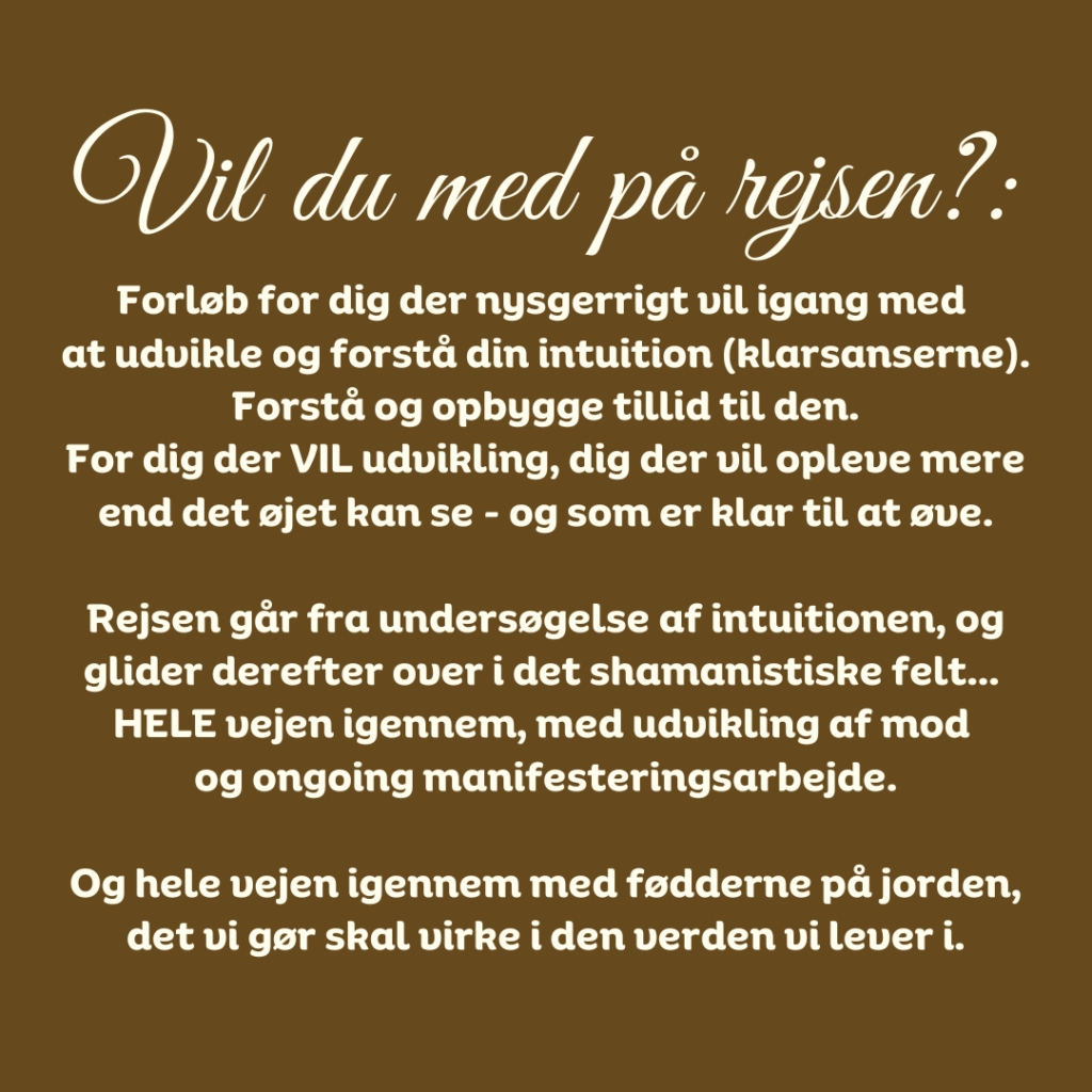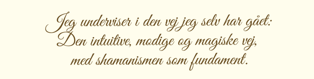 Min intention med forløbet, er at lave det forløb jeg selv kunne have ønsket mig; samle al den viden, teori – alt det jeg selv har lært, erfaret OG BRUGER – omkring intuition/klarsansning, shamanisme, mod og manifestering og give det videre i et format, der er brugbart for dig der vil spirituel udvikling, dig der vil finde DIN retning, og dig der vil arbejde professionelt indenfor feltet med 1:1 klienter eller spaceholding.