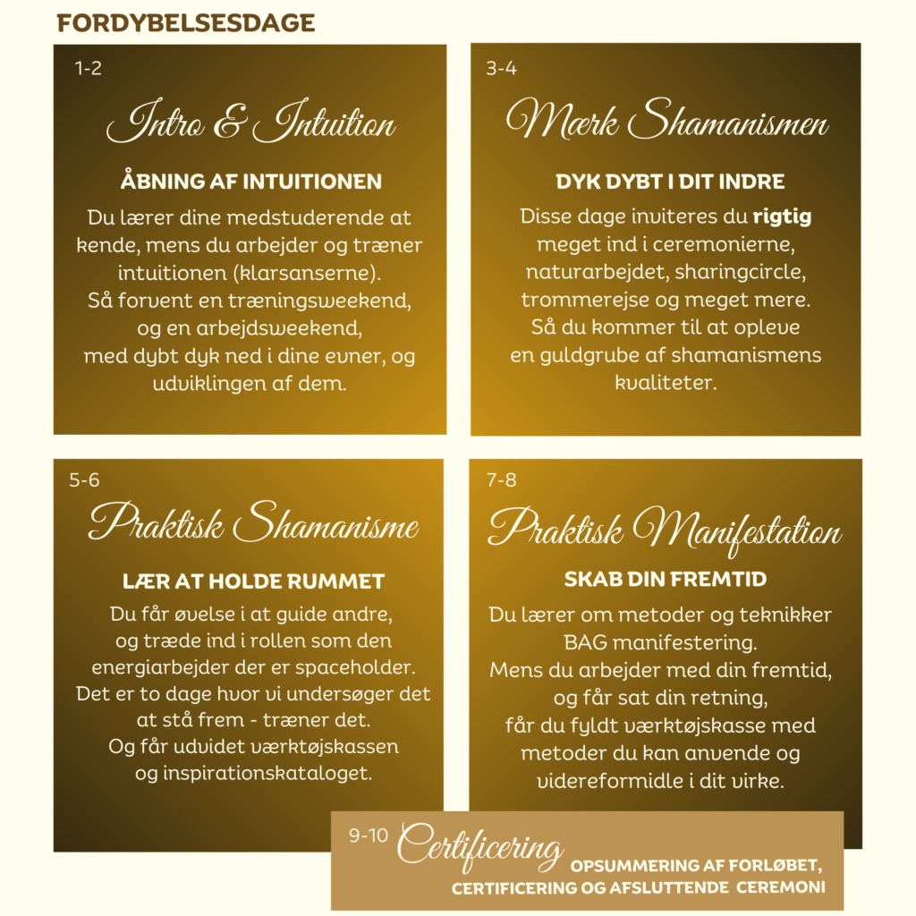 Efter neddykket i intuitionen kobler vi SHAMANISMEN på, og du kommer til at lære om at holde rum for grupper og cirkler, guidet af intuitionen, sjælen og dine hjælpere fra universet.